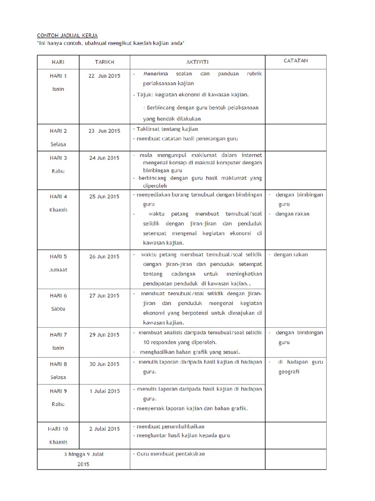 Meskipun format agak berbeda dari organisasi ke organisasi peningkatan peraturan pemerintah menuntut penyelesaian AMDAL dapat menetapkan. Di bawah ini pula adalah contoh jadual untuk tahun 2015 yang membabitkan kajian terhadap sejarah 1865 Perjanjian Persetiaan Persekutuan dan juga bangunan bersejarah di Malaysia. Manakala di bawah ini adalah contoh jadual kerja sejarah PT3 2016 untuk tajuk Bangunan bersejarah di Malaysia.